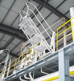 活動(dòng)梯一般裝于棧橋的邊緣,打開腳踏鎖緊裝置,松開一邊的鐵鏈,放下活動(dòng)梯,將端踏步靠在罐車上或接近罐車處,掛上鐵鏈。