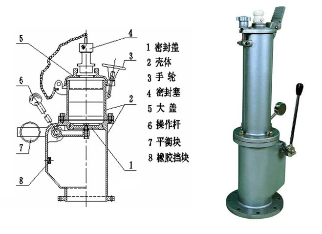 本產(chǎn)品結(jié)構(gòu)如圖示,狹口式量油孔的殼體由一密封蓋將其分成上下兩部分,下部分與儲(chǔ)罐相聯(lián),上部分殼體頂部設(shè)有可開啟的密封塞,密封蓋的操作桿(手柄)位于殼體外。測(cè)量時(shí),先開啟密封塞4,裝上量油尺器具或其他型式的測(cè)量工具,搬動(dòng)操作桿6,開啟密封蓋1,使量油器具從密封塞的孔內(nèi)穿過,并插入油品中,完成測(cè)量。測(cè)量完畢后,取出測(cè)量工具,關(guān)閉密封蓋,重新裝上密封塞。
