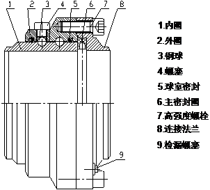 鋼制旋轉(zhuǎn)接頭主要由內(nèi)圈、外圈、法蘭、主密封件、滾道密封、鋼球和聯(lián)接螺栓等零件組成(見下圖)